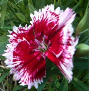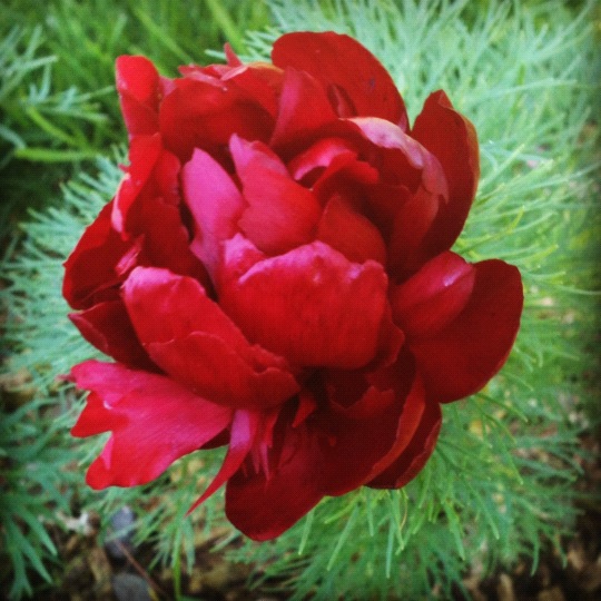 A fern leaf peony is a flower that must be displayed front and center. The flower is a deep red double bloom that emerges early and lasts long. The blooms are large, but unlike taller growing peonies, the fern peony grows only about a foot high and has no problem of falling over under the weight of the bloom.
