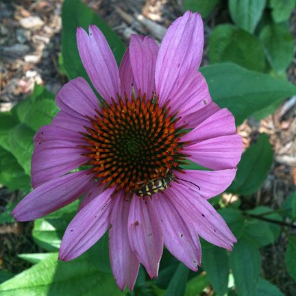 Echinacea purpurea commonly known as Eastern purple coneflower or Purple coneflower or Asteraceae (from the Aster Family). Native to U.S. A popular perennial with smooth, 2-5 ft. stems and long-lasting, lavender flowers. Rough, scattered leaves that become small toward the top of the stem. Flowers occur singly atop the stems and have domed, purplish-brown, spiny centers and drooping, lavender rays.