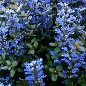 Generally, most types of Ajuga only reach a height of 6-9 inches when in full bloom. Ajuga–more commonly known as Bugleweed–grows along the ground, spreading by runners, and soon creates a thick carpet of foliage. Ajugas are members of the mint family, and like most mints, their rapid growth rate may create problems. If this invasive attribute of Ajuga is a problem, it may be necessary to use some type of edging material to keep it within bounds.